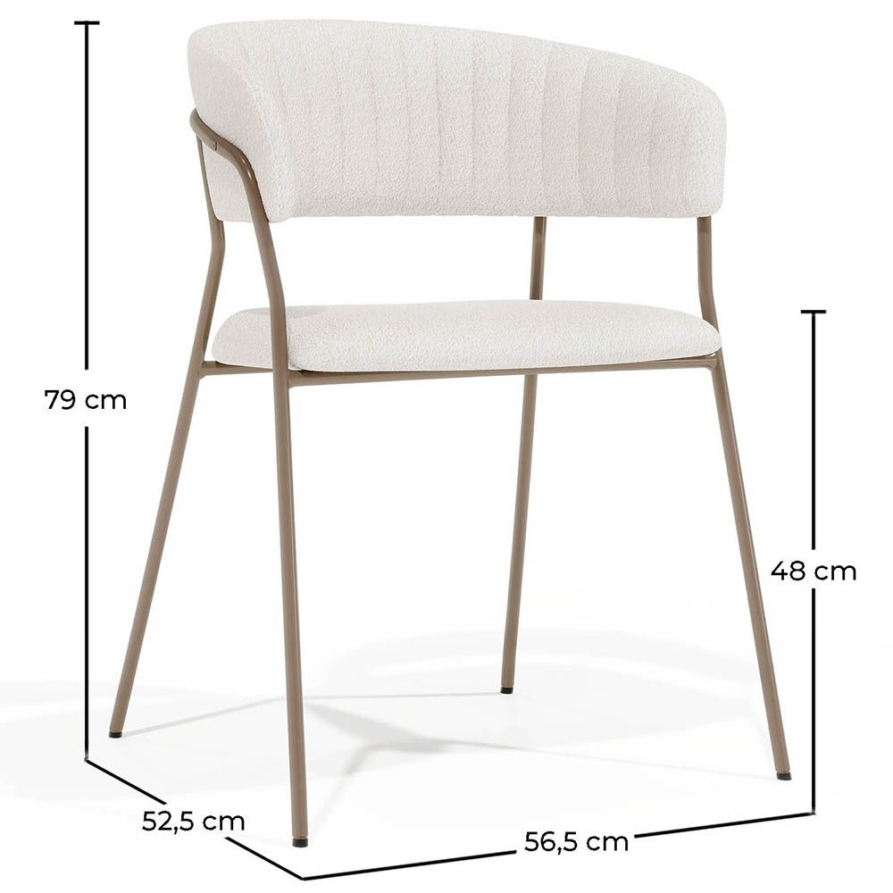 The dining chair upholstered in bouclé fabric with a champagne-colored metal structure is an elegant and versatile piece that perfectly combines style and comfort. Its bouclé fabric upholstery provides a soft and cozy texture, offering a sense of luxury and comfort to those who sit on it. This fabric is also durable and resistant to wear, making it an ideal choice for high-traffic spaces such as hotels, restaurants, and homes alike. The metal used in its structure is sturdy and robust, ensuring a solid and stable foundation for the chair. Additionally, the champagne color is elegant and versatile, allowing it to seamlessly blend into different decorating styles.