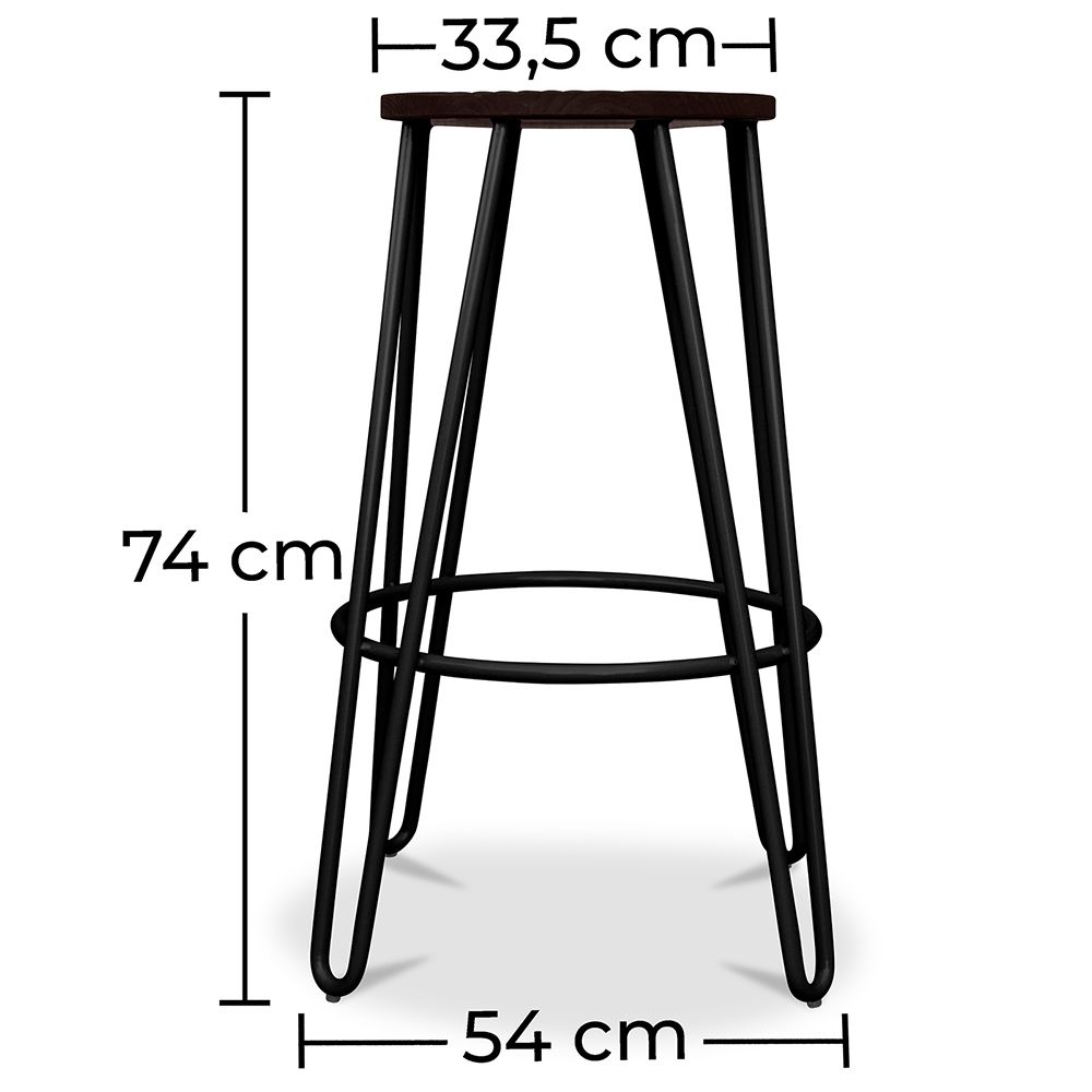 This modern hairpin bar stool is 74 cm height and the round seat has a diameter of 47cm. It is made of high quality solid wood and its steel hairpin legs have a powder coating paint finish. It is perfect for a kitchen bar as you can also stack them up to 4 stools.